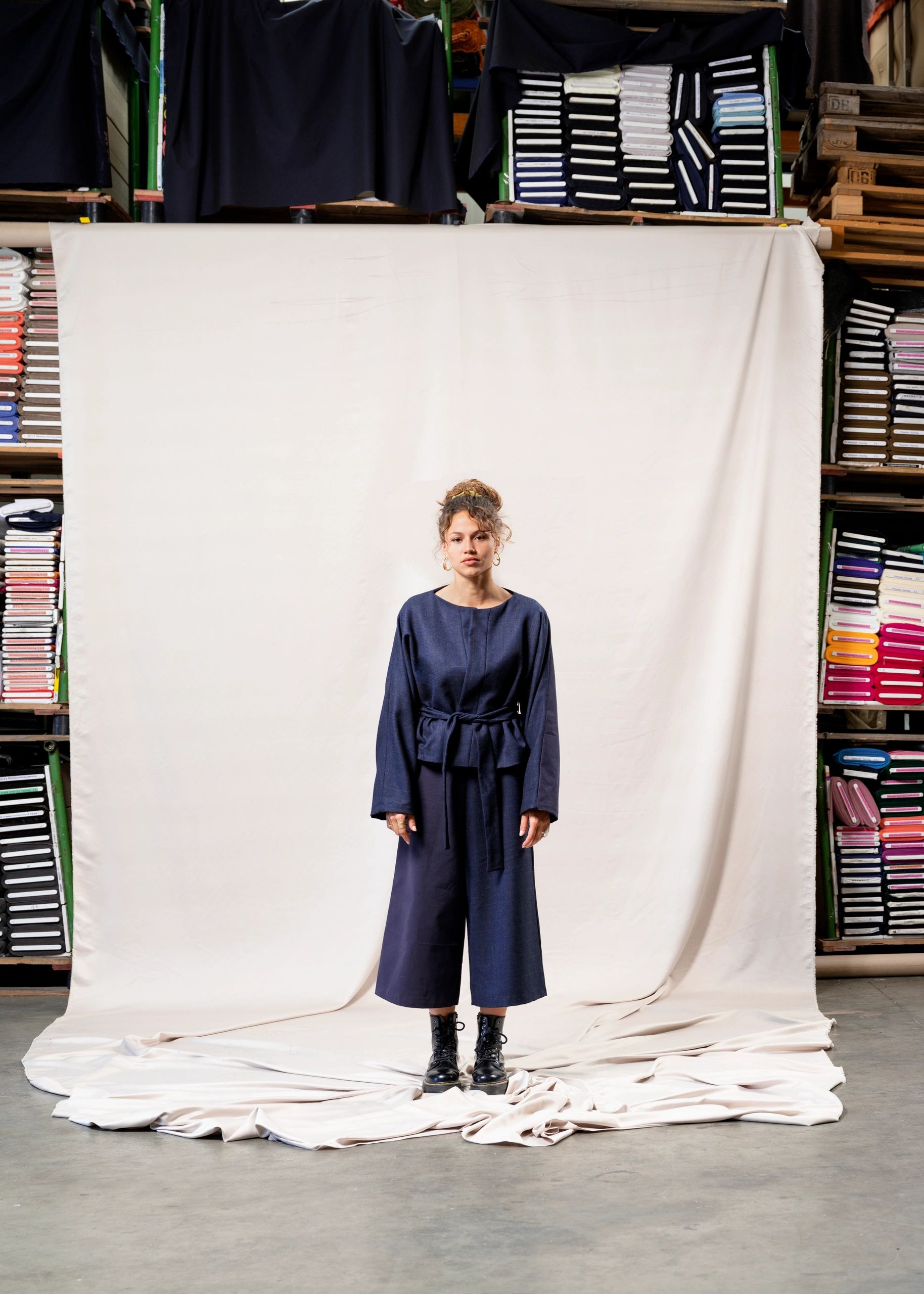 An exploration of textiles in the fashion industry, ‘Left to Use’ diagnoses the unhealthy habit of wasting large quantities of fabric, then proposes an elegant remedy: a universal methodology for creating new collections from leftovers. There are plenty of challenges: for fabric colour, weight and length you get what you’re given. Navigating resourcefully around these restrictions, Elena Naumann combines materials by weight and uses a basic pattern derived from the timeless kimono. Straight lines allow for efficient cutting and the loose fit can be adapted for all garments, whether lengthened for a dress or split for a jacket. By cultivating a considered approach, and accommodating chance, ‘Left to Use’ nurtures a system that restores value and meaning to waste.